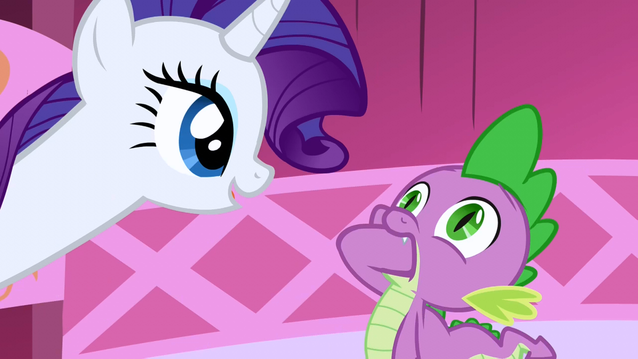 Twilight then tells her to screw off, and then she gets rained on. All I could think was, well, what did you expect, dumbass? She is then found by Rarity, who laughs at her stupid wet mane and brings her to her boutique for a makeover. After being thrown in a frilly dress in hopes she'll butter up to give Rarity the tickets, she notices that Spike is eating his own arm (no, seriously, look at this frame) and decides to leave him to go back to her lunch. Applejack overhears this and takes her to try some of her many apple foods, and after eating delicious pie, decides to give Applejack the ticket.