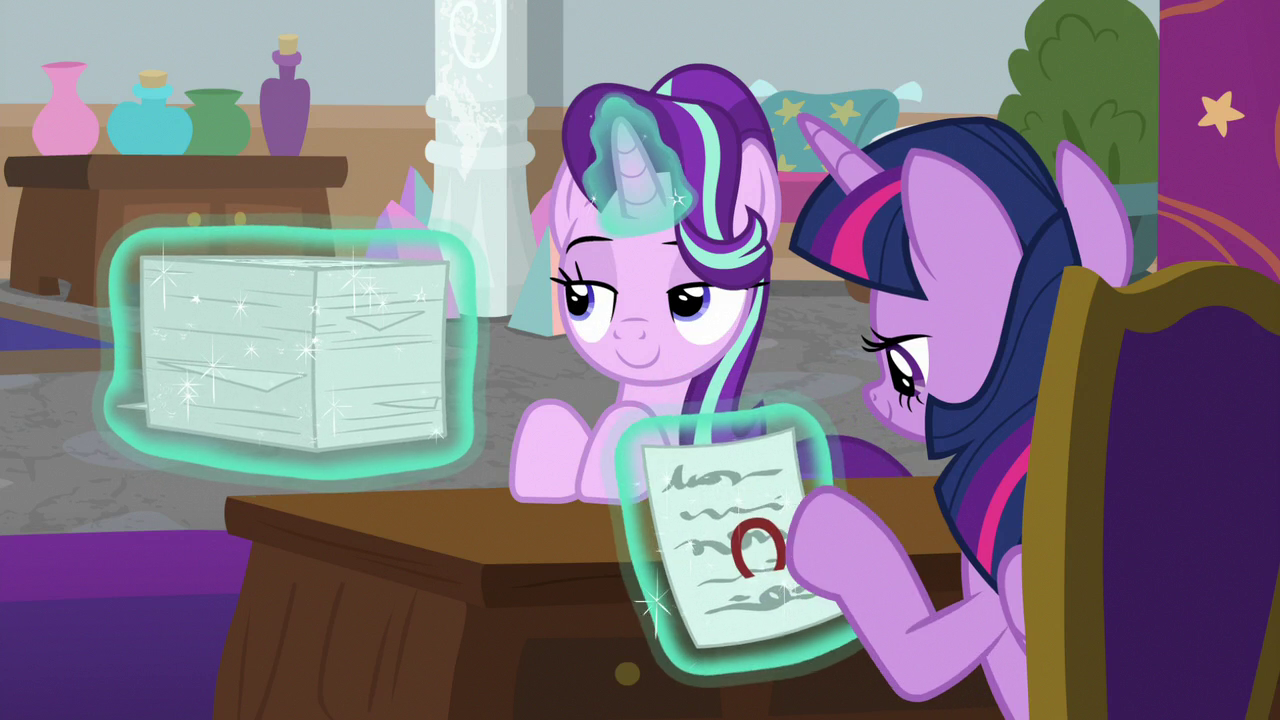 Spike's so excited to receive Shining Armor's letter that he burst in Twilight's office, accidentally spooked Starlight enough to cause her to drop a stack of papers on the floor, and unroll his scroll with extreme glee. All punctuated by a very happy trumpet score in the background. Ten seconds in, the audience begins to have a quick impression of what its tone, atmosphere, and overall direction could be: casual, fun, and possibly exciting. The crown may be a toy, but Spike's face and Twilight's subsequently surprised reaction reveal how important it is to them: It establishes a friendly sibling rivalry between her and older bro Shining Armor, which the montage shows they had a huge amount of fun to earn it. That toy crown's nostalgic, a will to be impressive during the week, and improve if you miss it. Being a bro himself, Spike's excited to see SA revive it, even if for one more time.