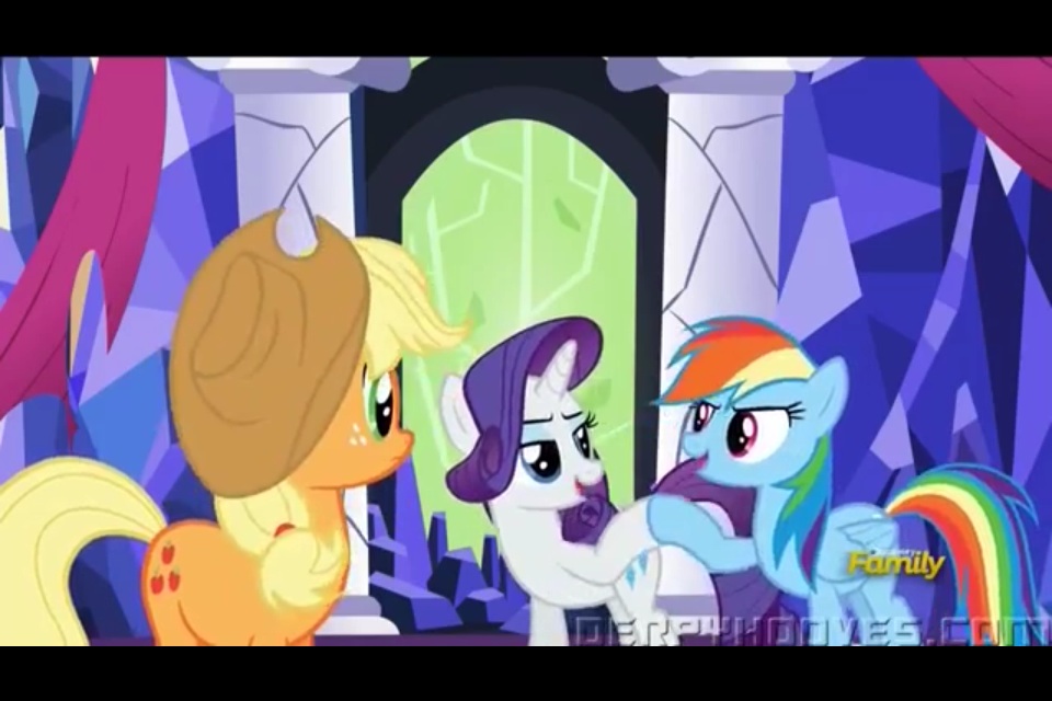 An unfortunately rare sight - https://derpicdn.net/img/view/2015/3/28/858876__safe_rainbow+dash_rarity_applejack_screencap_spoiler-colon-s05_brohoof.jpg