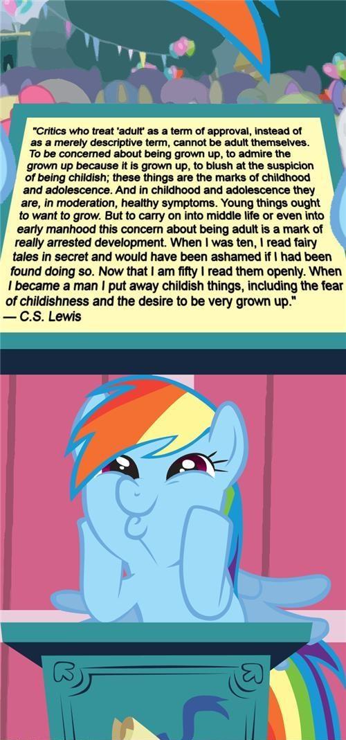HOLY CRAP!!! This just might be the most beautiful and succinct defense of bronydom I've ever read; and it was written by C.S. Lewis!!! Holy cow, as if I didn't need more reasons to love the guy, now it sounds like, if he had lived to see it, he actually might've supported bronies! AWESOME!!! http://i2.kym-cdn.com/photos/images/newsfeed/000/351/735/daf.jpg