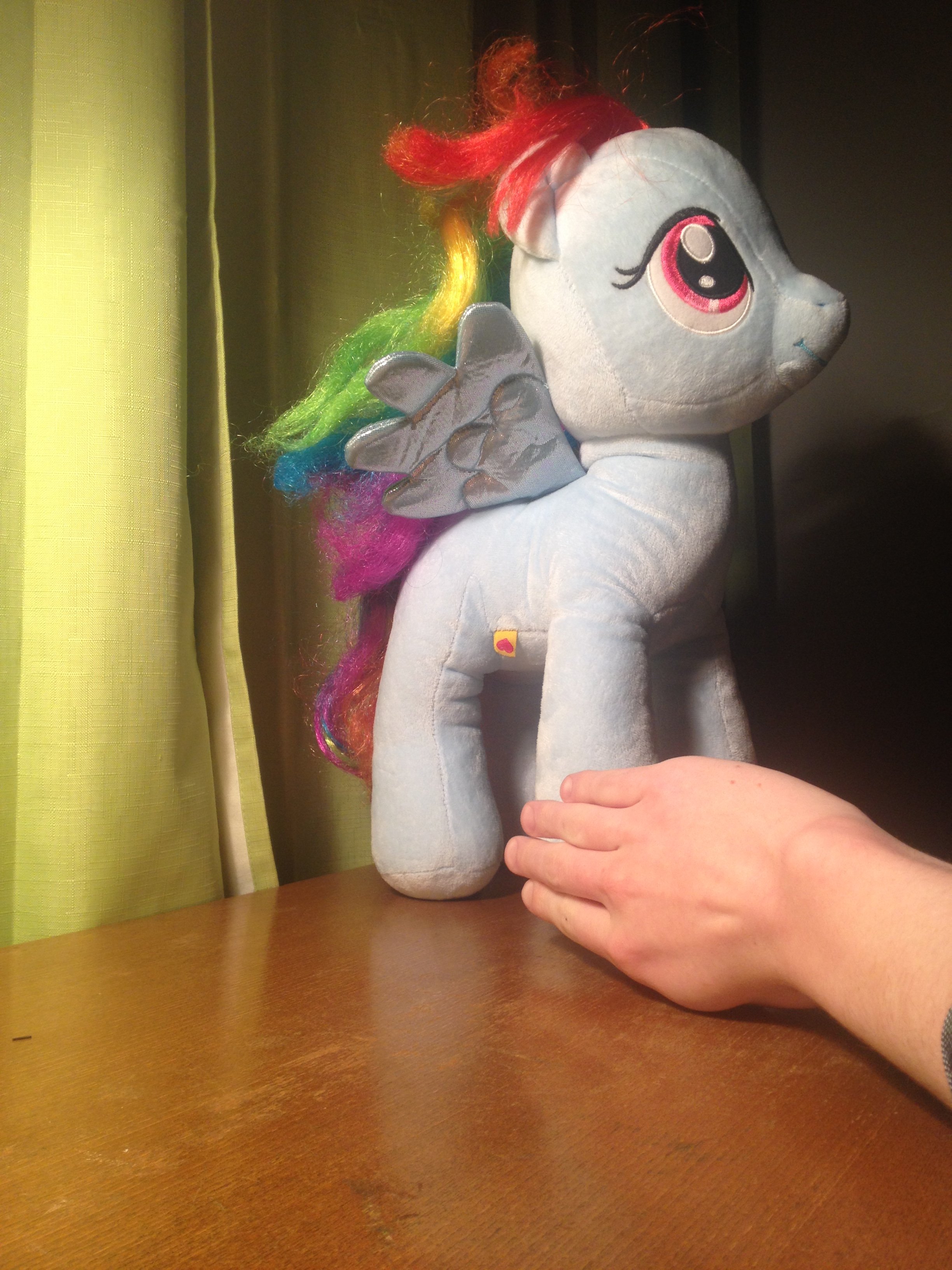 So, look at what my parents got me! I got this sweet li'l thing from my parents after their visit to the Goodwill Outlet. It was in a bin, a lot of people were grabbing stuff from it. My parents got sweet Rainbow Dash from it. I couldn't be happier.