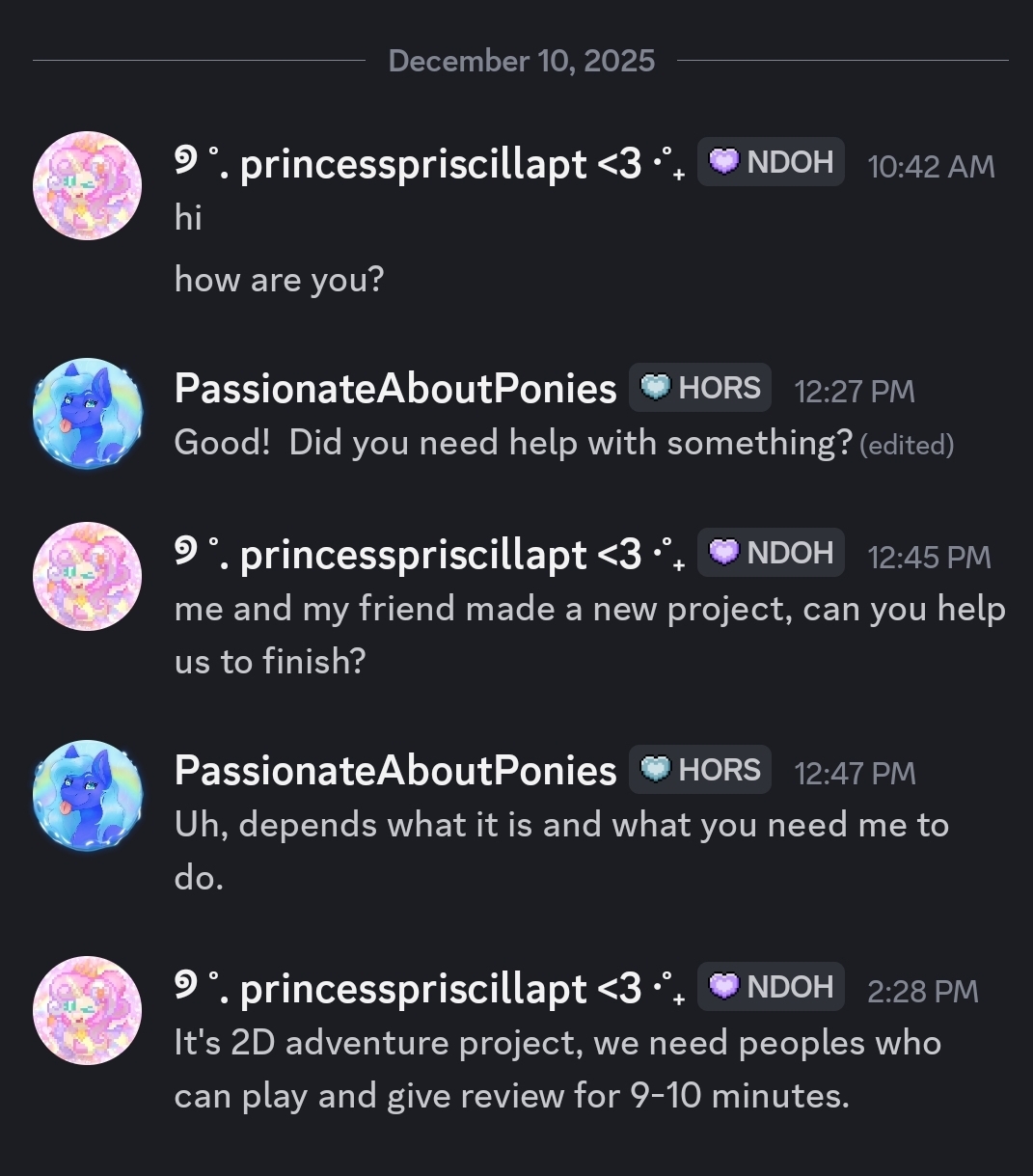 This is exactly how the scam starts — innocent messages, a fake “test my game” download, and then they attempt to steal your information.That’s all for now—please stay safe out there, everypony!