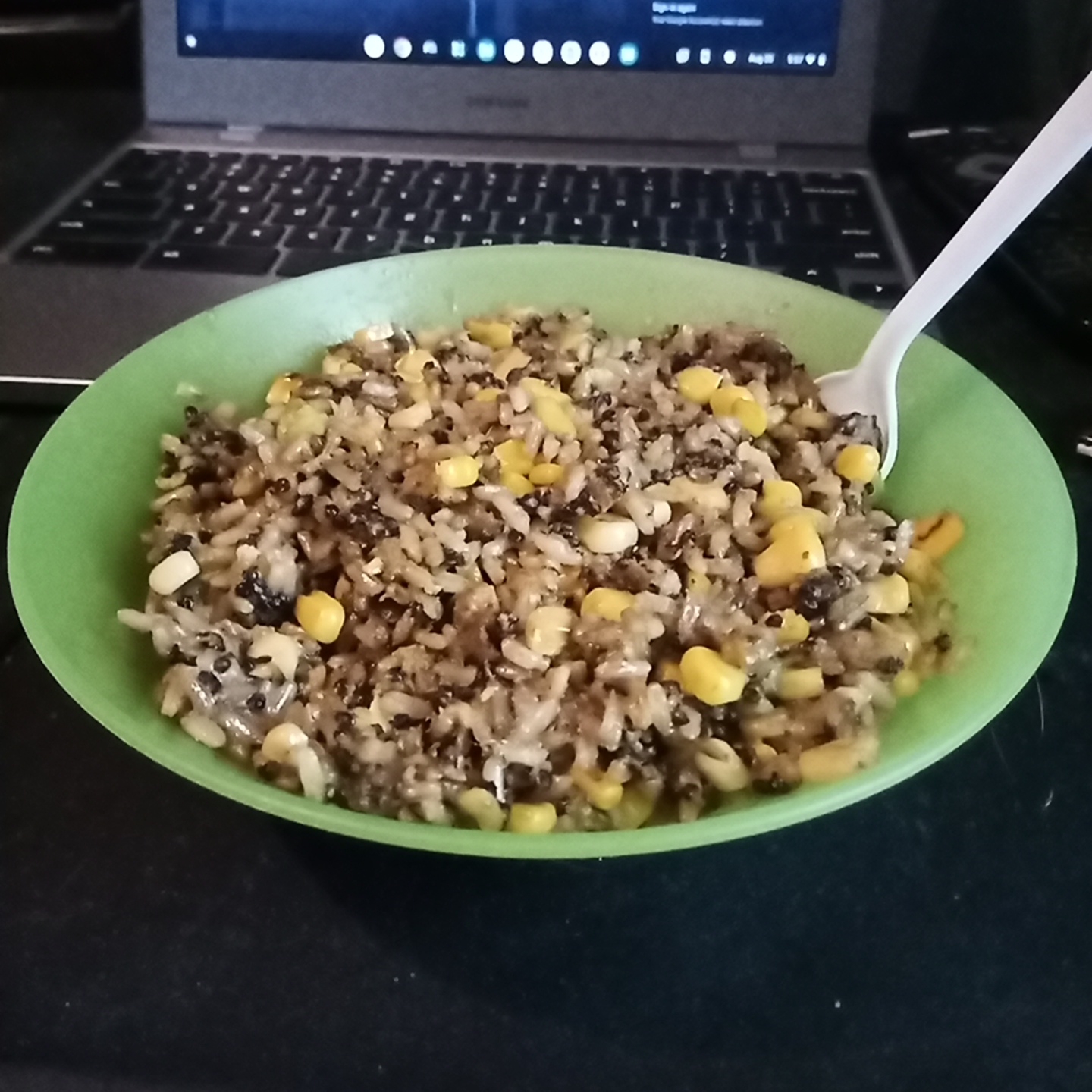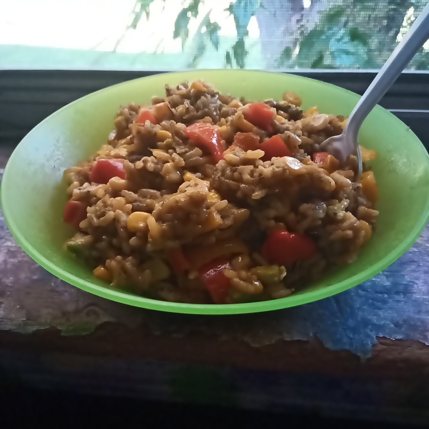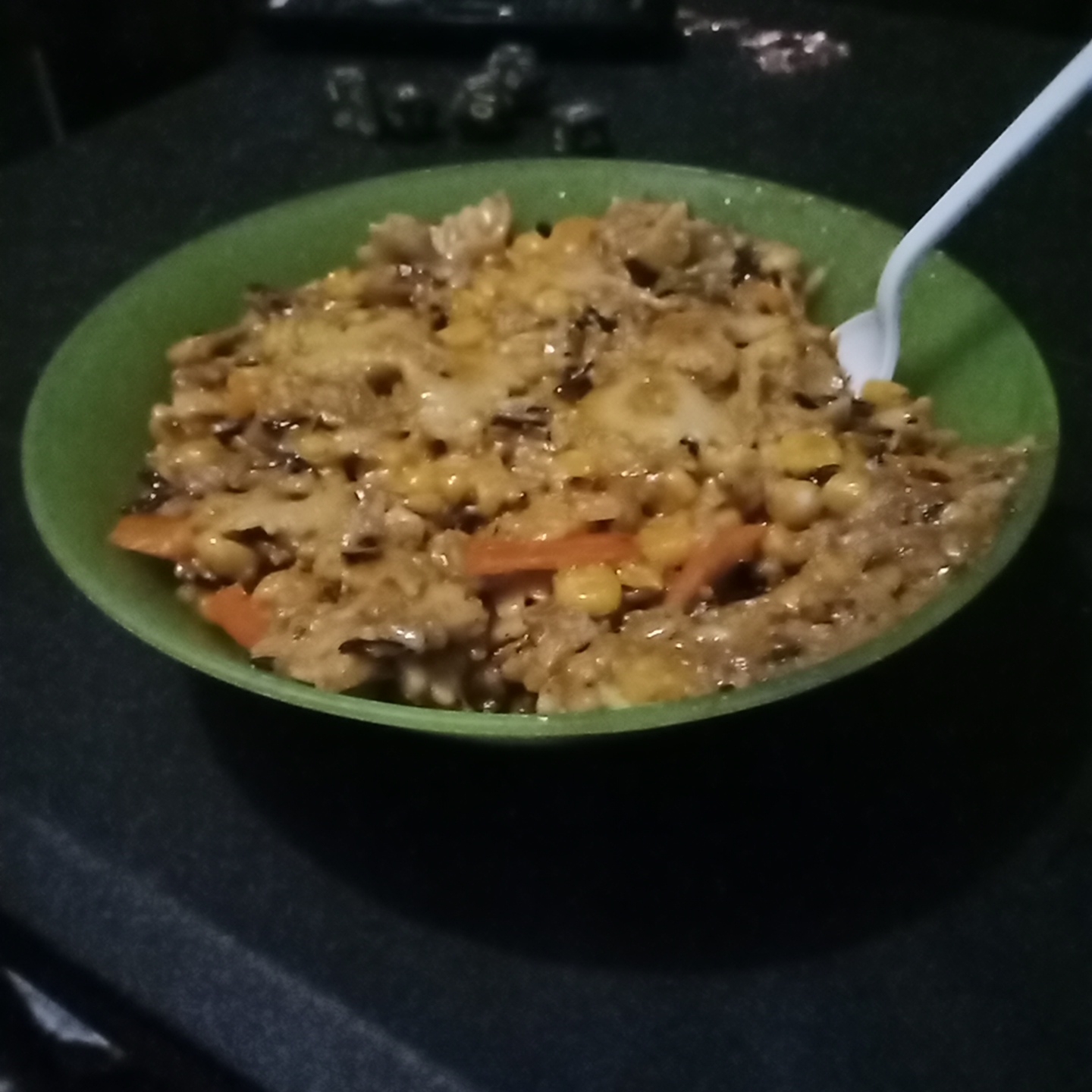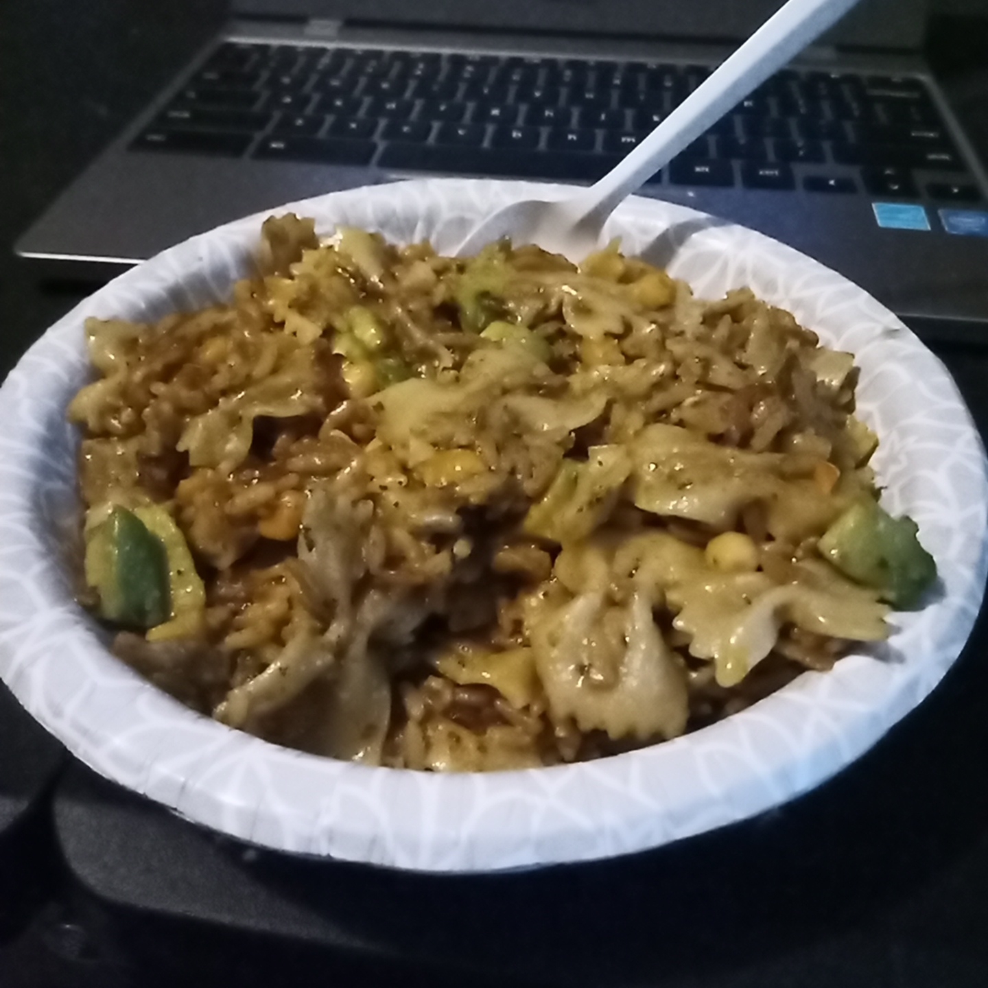 Quinoa rice pasta w/ fiesta corn, diced peppers, avocado sauteed in honey mustard hot sauce, smokey horse radish sauce, smokey tomato sauce, and almond swiss cheese spread.