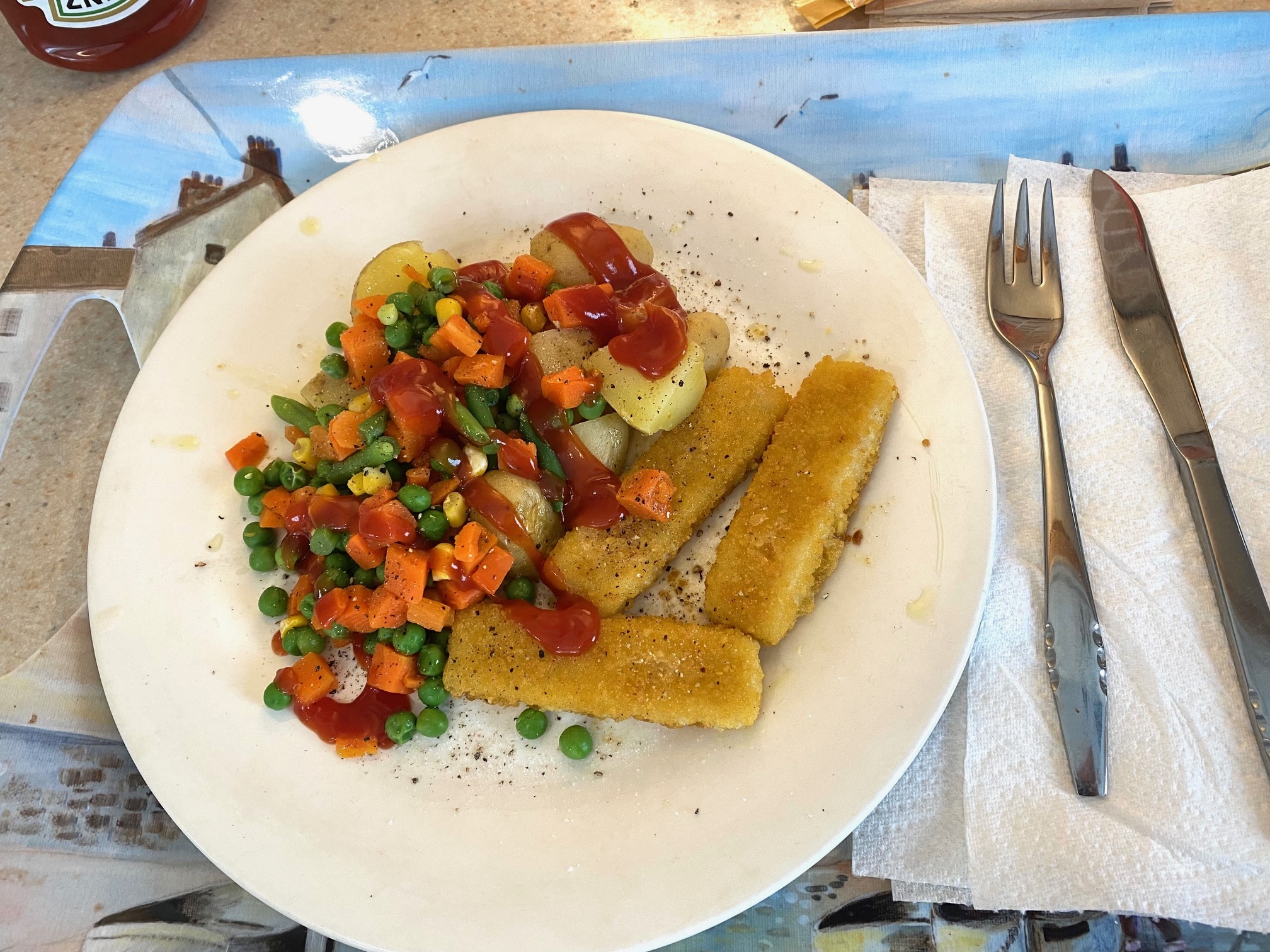 I actually cooked spaghetti and ate it with chopped pork sausages, potato slices & lettuce fried in a pan in olive oil, then added Dolmio sauce ... only 100 grams of spaghetti but couldn't eat it all! :0 So in a box for later...