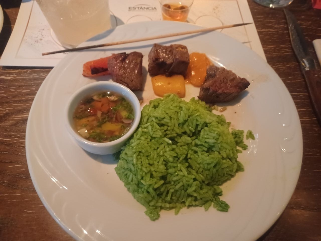 • Prime beef tenderloin skewer, spice-marinated and grilled Brazilian-style, with green rice of broccoli, asparagus, and spinach puree
