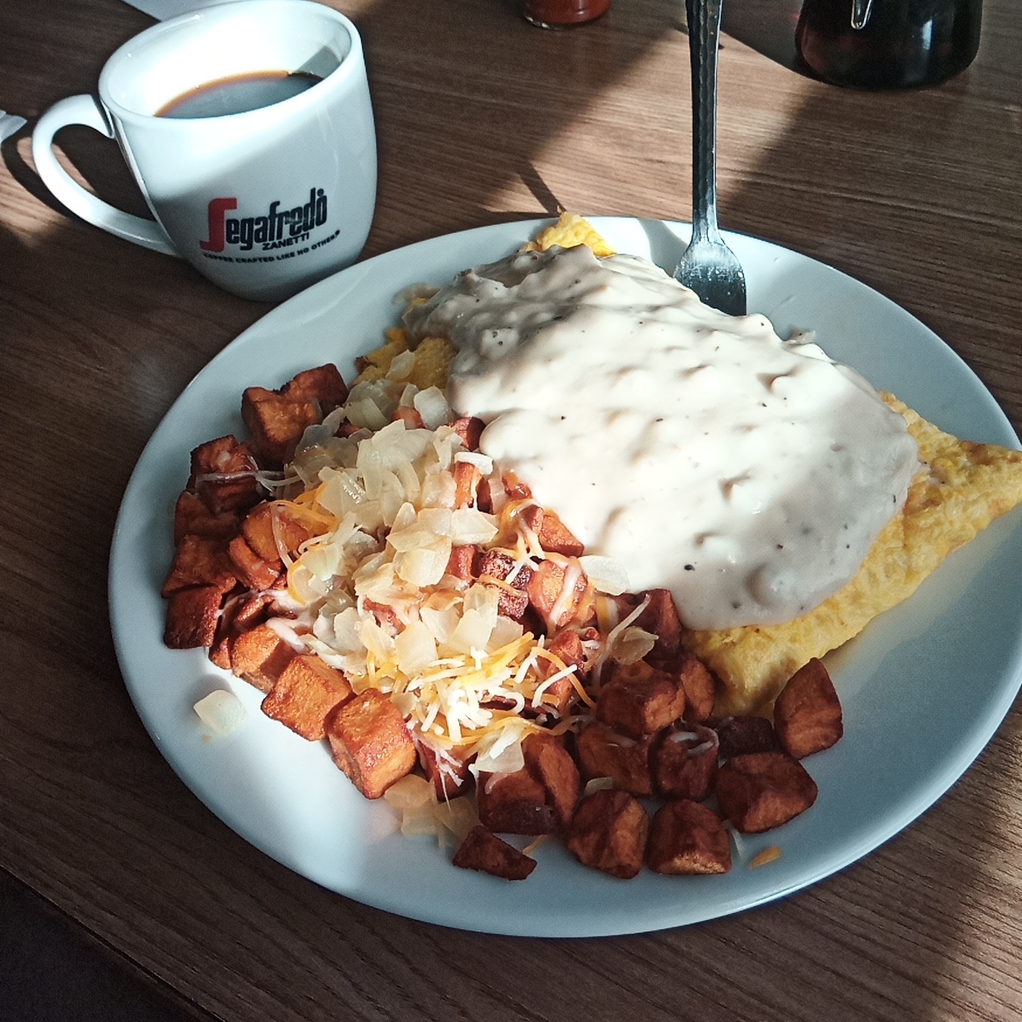 Followed by a country biscuit omlette w/gravy and fried potatoes w/ onion and cheese.