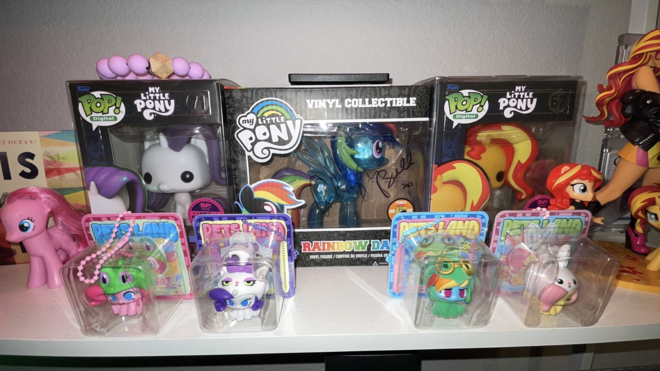 iceestarz 5,817 December 11, 2025 Share December 11, 2025 I have some more plushies but they are upstairs in a closet lol. I have tiny kids who like ponies and messing with stuff so I have to have everything basically out of reach lol. This is most of what I have. Though I have a few things at my office. And a little bit in storage. I also have 4 more EQG dolls but I need to get more stands so they aren’t out. these are my favorite things I have besides the airship. Most of which were gifts. The funkos and signed rainbow dash were from my husband. The little keychains were from my work friend. The pinkie is funny enough the first figure I ever got. My mom gave it to me like 12 years ago randomly after she went to the store. 2 1 Link to comment Share on other sites More sharing options...